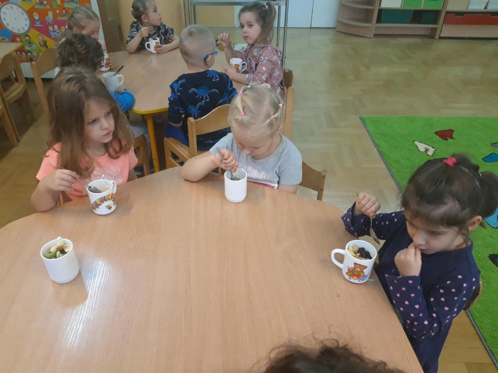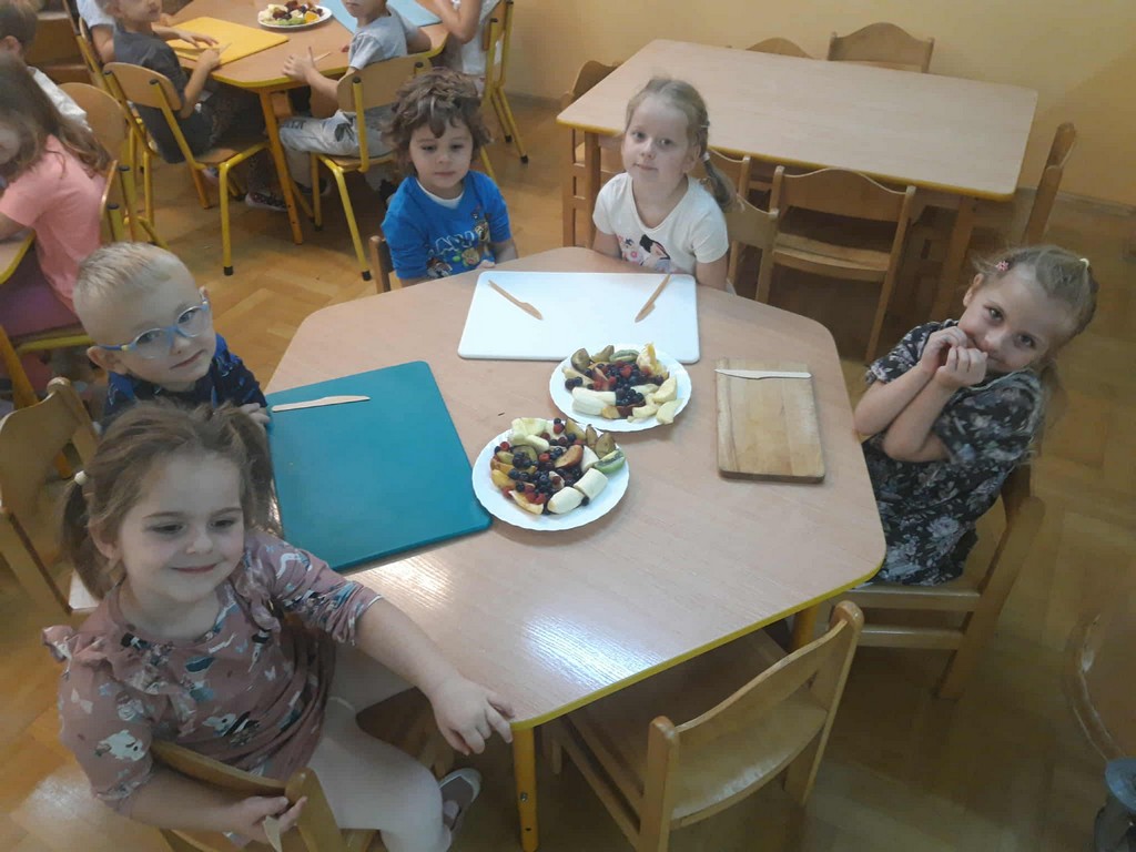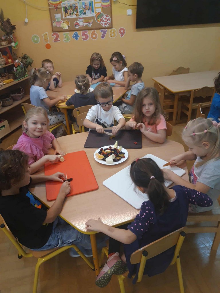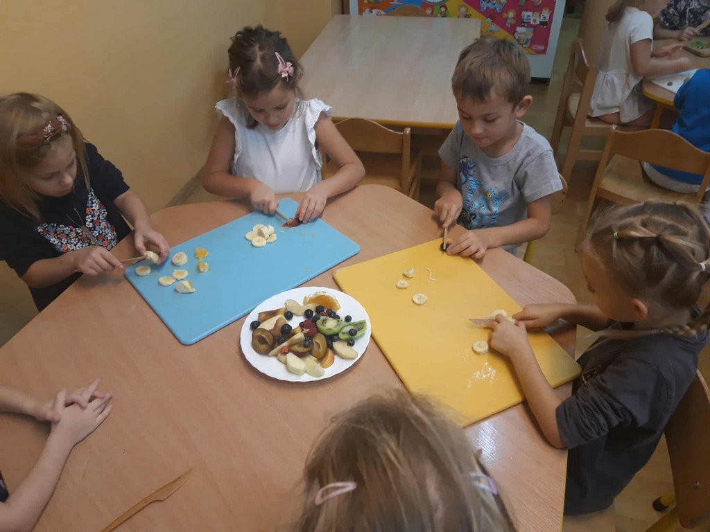 Dzieci samodzielnie pokroiły owoce i przyrządziły sałatkę pamiętając o zasadach higieny oraz bezpieczeństwa podczas posługiwania się nożem. Zadanie to dostarczyło dzieciom wiele radości oraz satysfakcji ze wspólnie wykonanej pracy, a własnoręcznie wykonana sałatka smakowała wyśmienicie.