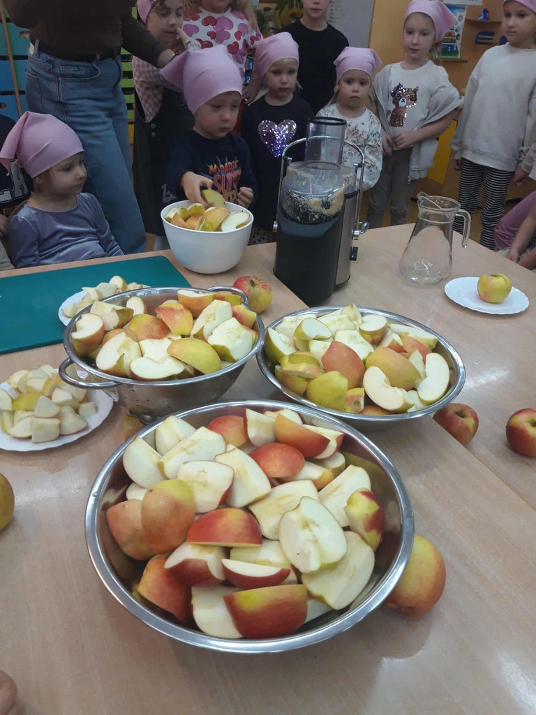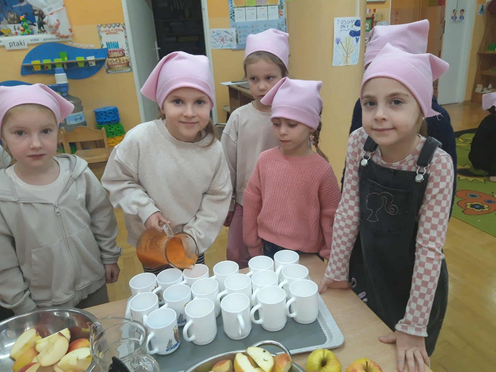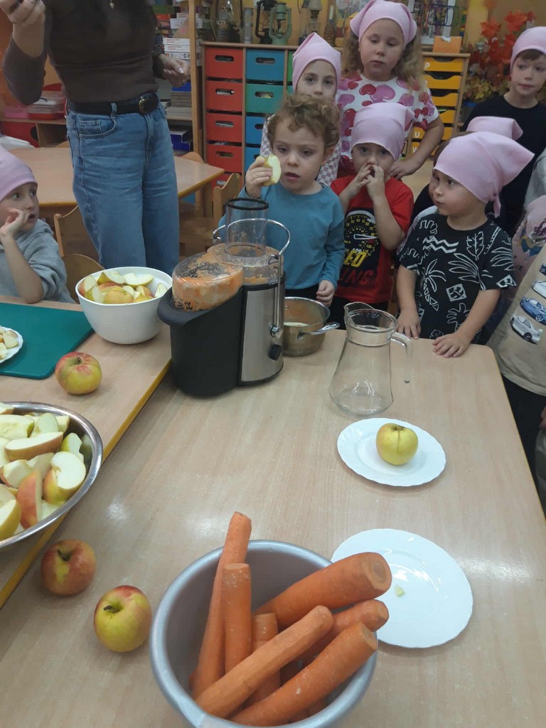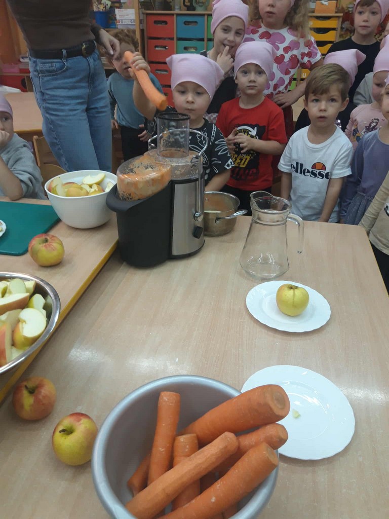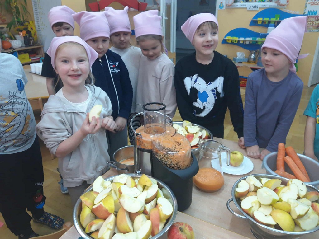I („Misiaczki”) i III („Tygryski”) przygotowały wspólnie pyszny i zdrowy sok jabłkowo-marchewkowy. Wszyscy dobrze wiemy, że soki to doskonałe źródło witamin i cennych składników.