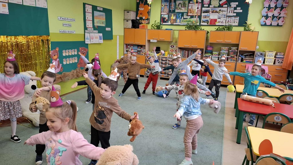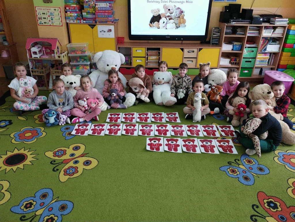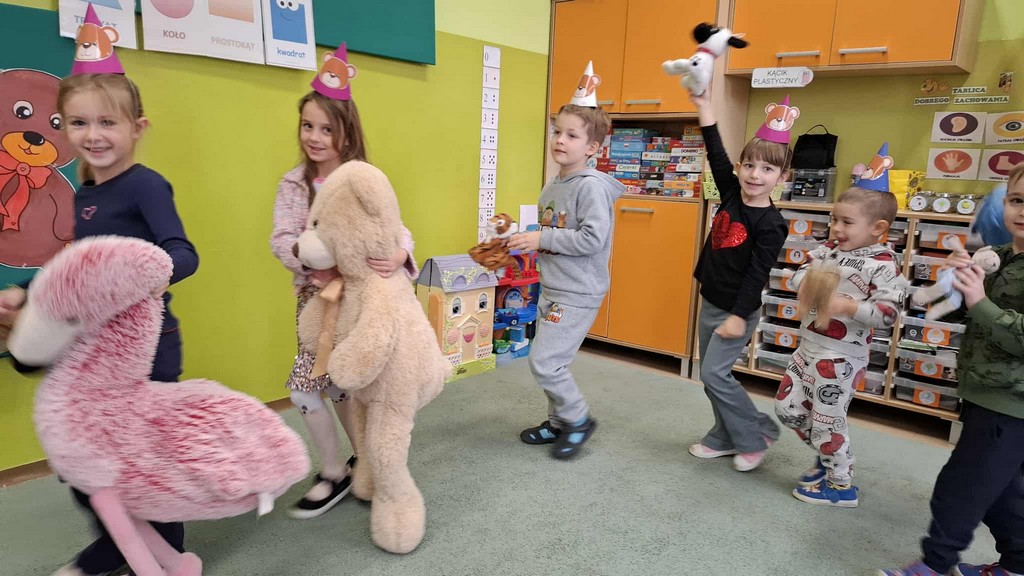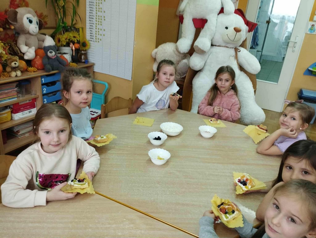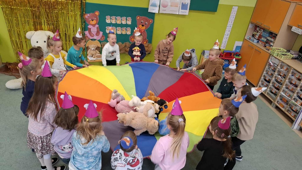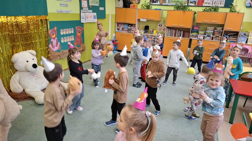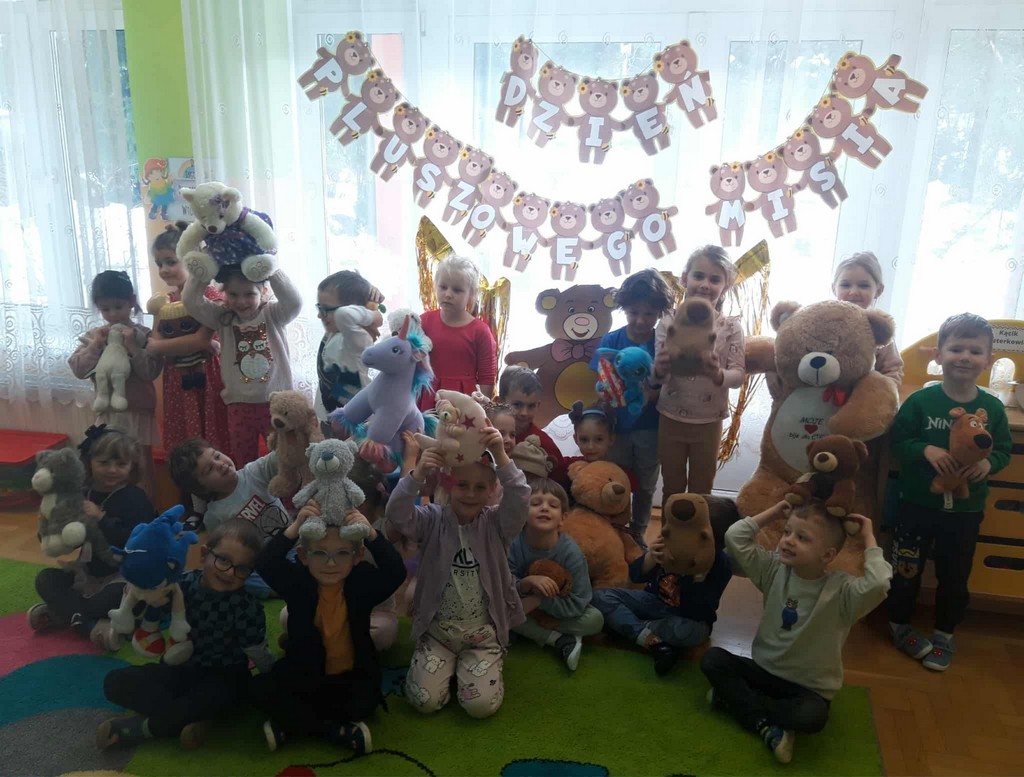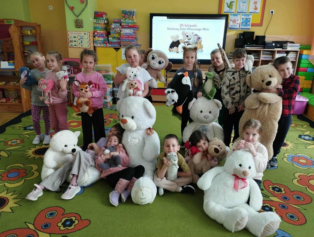 25 listopada tradycyjnie obchodziliśmy „Dzień Pluszowego Misia”. Dzieci przyniosły do przedszkola swoje ukochane pluszaki, a każdy z nich był inny i wyjątkowy. Misie towarzyszyły dzieciom podczas śpiewania piosenek, słuchania tekstów literackich, rozwiązywania zagadek, oglądania bajek. Wśród wielu atrakcji zaplanowanych na ten dzień znalazły się; konkursy, zręcznościowe tory przeszkód, zabawy ruchowe oraz taneczne przy utworach z misiami w roli głównej. Największym jednak wyzwaniem dla dzieci było samodzielne przygotowanie torcików. Biszkoptowe ciasteczka specjalnie upieczone na tę okazję, zostały udekorowane bitą śmietaną, owocami, żelkami oraz kolorową posypką. Torciki nie tylko wyglądały pięknie i kreatywnie, ale smakowały wyśmienicie. Mamy nadzieję, że misiowe przyjęcie pozostanie we wspomnieniach przedszkolaków na długi czas.