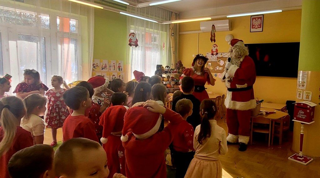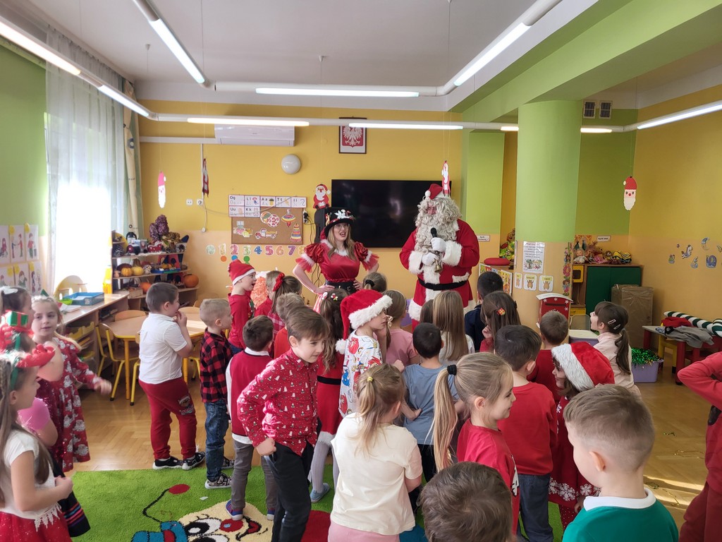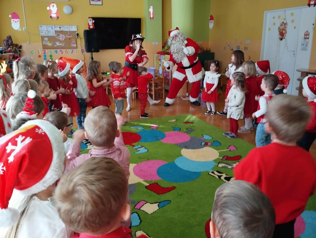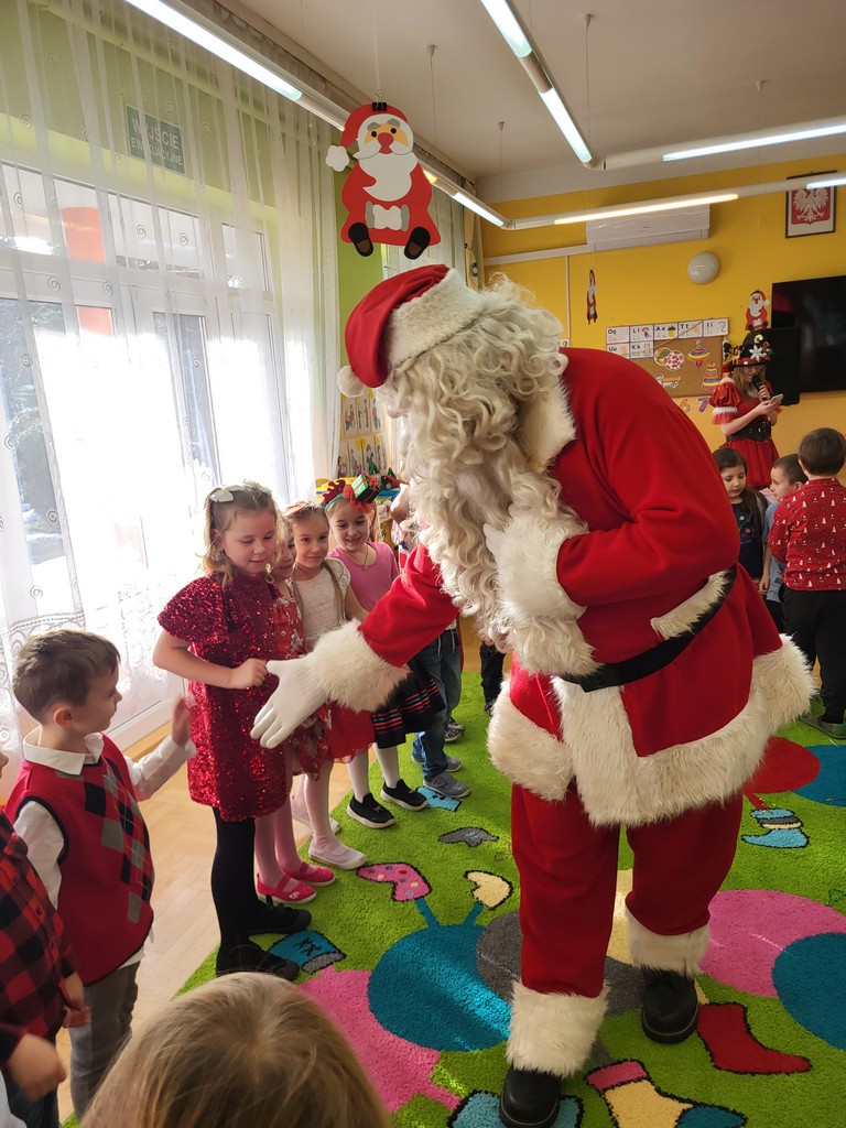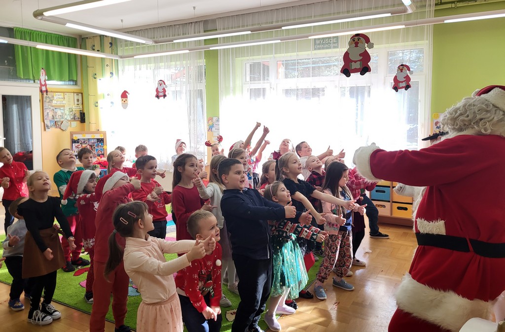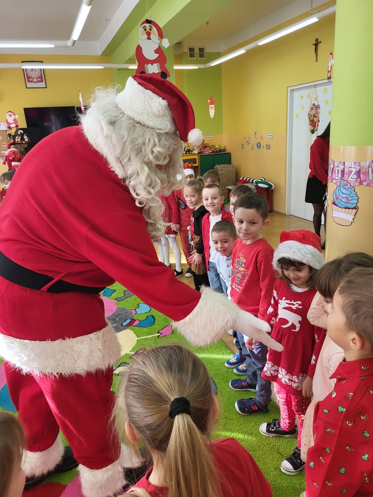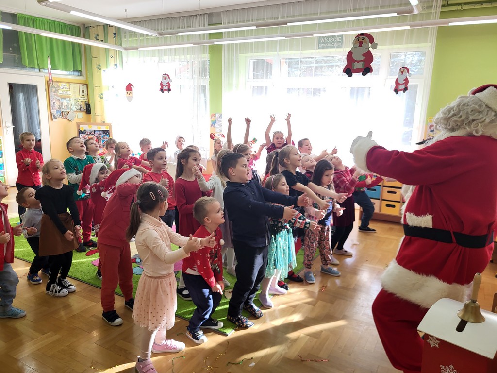 W poniedziałek, 1 grudnia, nasze przedszkole odwiedził wyjątkowy gość – Święty Mikołaj! Zanim pojawił się w salach, dzieci uczestniczyły w radosnej zabawie tanecznej prowadzonej przez panią Elf. Przedszkolaki tańczyły i bawiły się przy rytmach świątecznych utworów. Nie zabrakło zabaw z wykorzystaniem świątecznych rekwizytów: cukierków–grzechotek oraz małych tamburynków, które dodawały energii całej zabawie. Była też bitwa na śnieżki ze „śniegu” zrobionego z pianki poliuretanowej. Gdy do drzwi zapukał Mikołaj, na twarzach dzieci natychmiast zagościł zachwyt. Wspólnie z Mikołajem zatańczyliśmy przygotowany dla niego taniec. Każde dziecko otrzymało od niego piękny prezent, a na pamiątkę tego wyjątkowego spotkania zrobiło sobie z Mikołajem pamiątkowe zdjęcie. To był dzień pełen ciepła, uśmiechu i świątecznej atmosfery, który na długo pozostanie w pamięci naszych przedszkolaków.