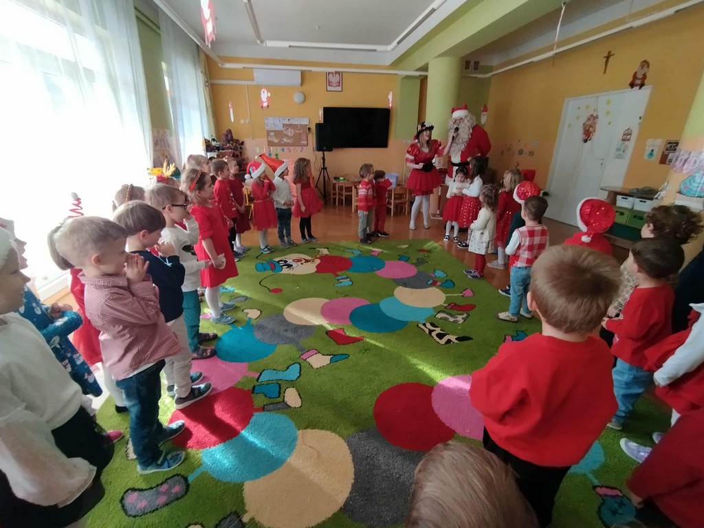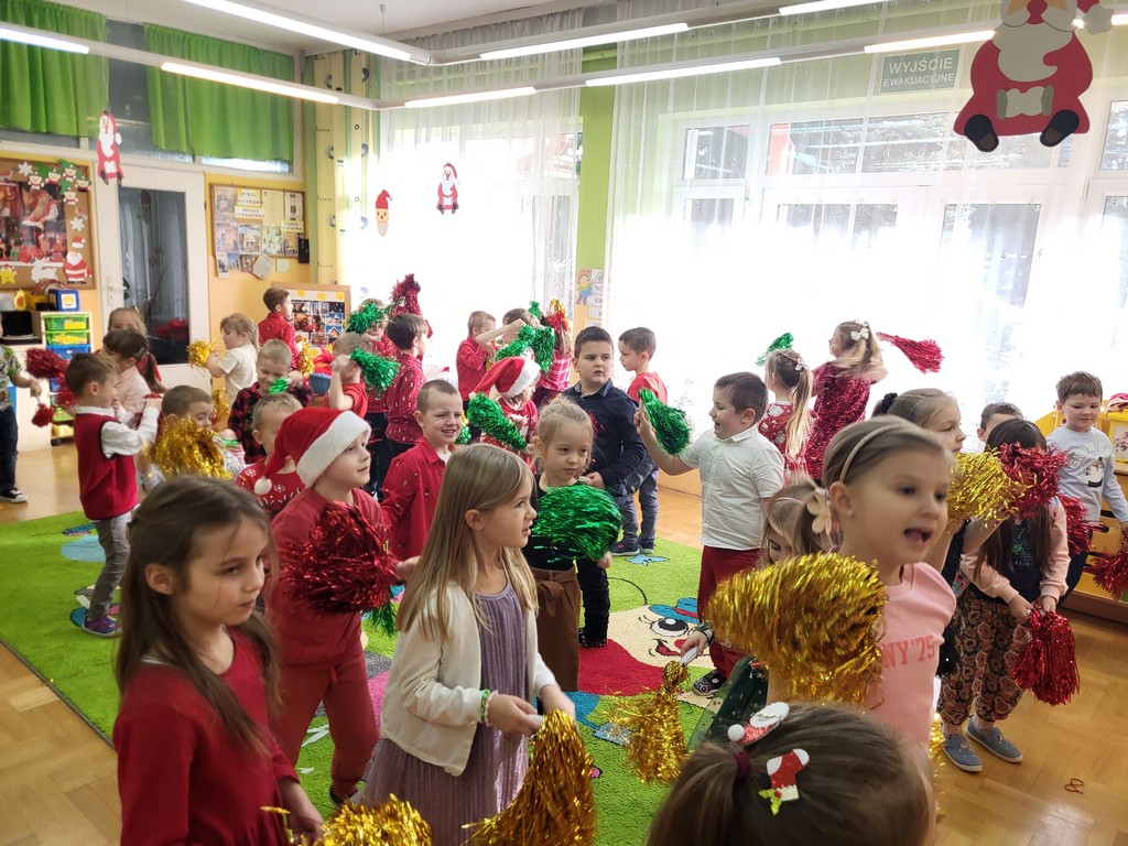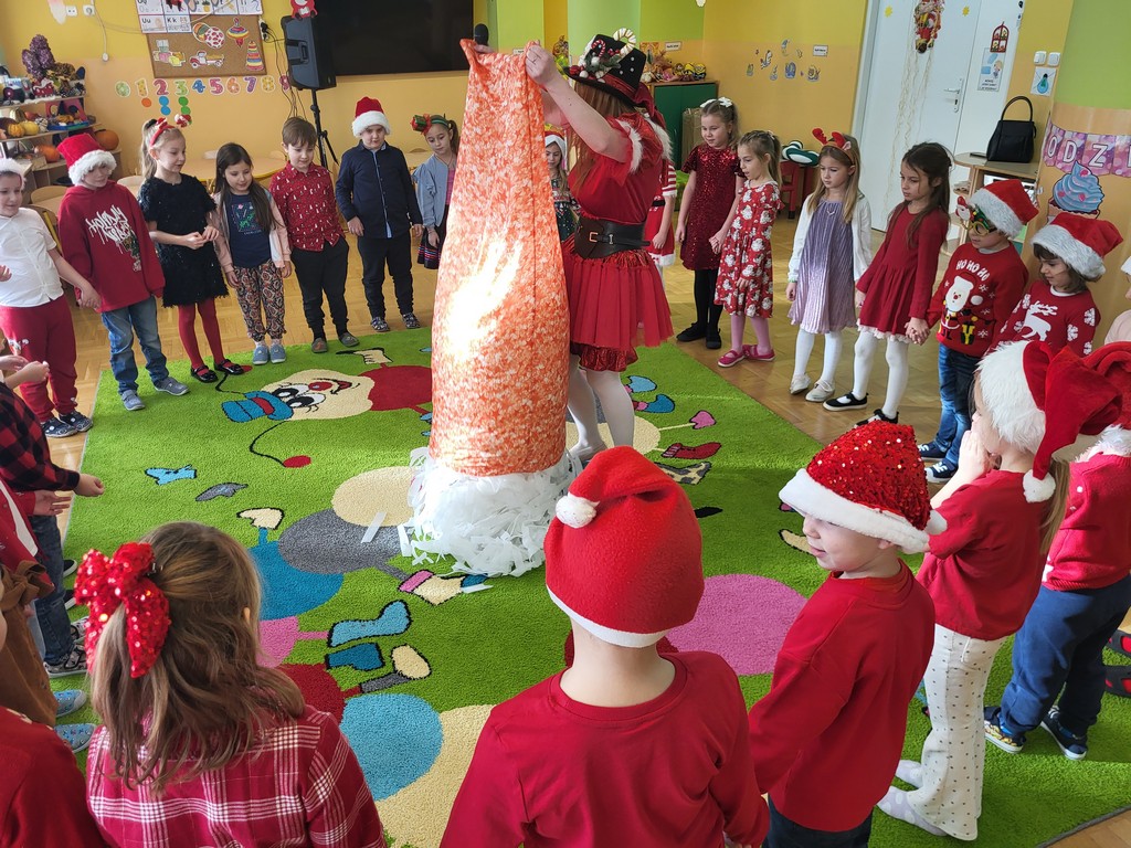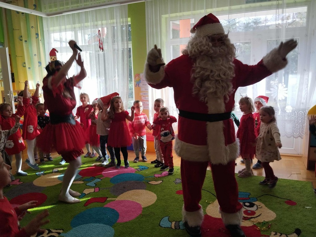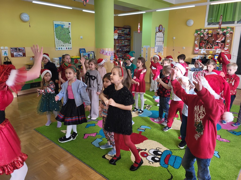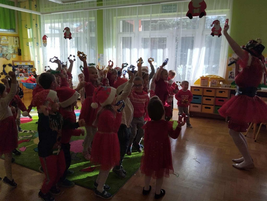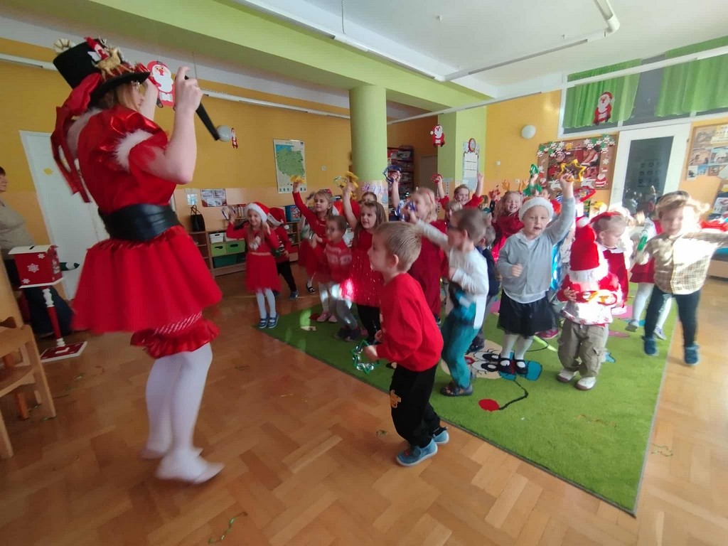 W poniedziałek, 1 grudnia, nasze przedszkole odwiedził wyjątkowy gość – Święty Mikołaj! Zanim pojawił się w salach, dzieci uczestniczyły w radosnej zabawie tanecznej prowadzonej przez panią Elf. Przedszkolaki tańczyły i bawiły się przy rytmach świątecznych utworów. Nie zabrakło zabaw z wykorzystaniem świątecznych rekwizytów: cukierków–grzechotek oraz małych tamburynków, które dodawały energii całej zabawie. Była też bitwa na śnieżki ze „śniegu” zrobionego z pianki poliuretanowej. Gdy do drzwi zapukał Mikołaj, na twarzach dzieci natychmiast zagościł zachwyt. Wspólnie z Mikołajem zatańczyliśmy przygotowany dla niego taniec. Każde dziecko otrzymało od niego piękny prezent, a na pamiątkę tego wyjątkowego spotkania zrobiło sobie z Mikołajem pamiątkowe zdjęcie. To był dzień pełen ciepła, uśmiechu i świątecznej atmosfery, który na długo pozostanie w pamięci naszych przedszkolaków.