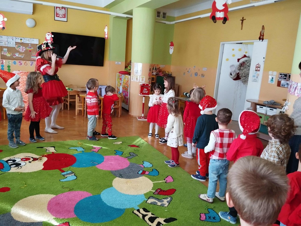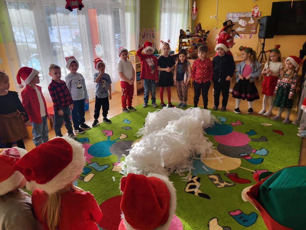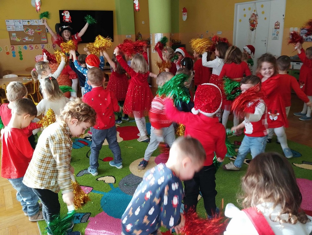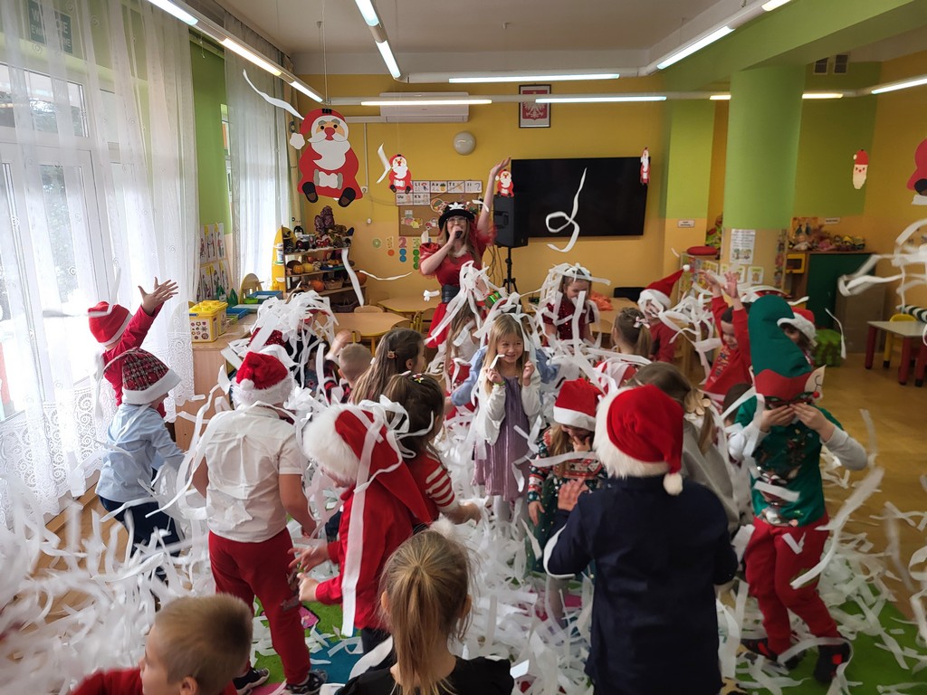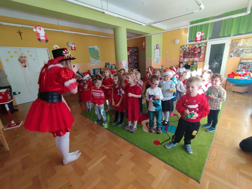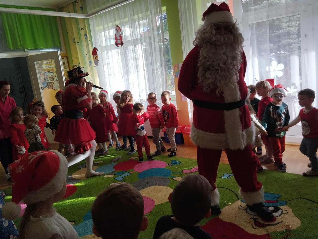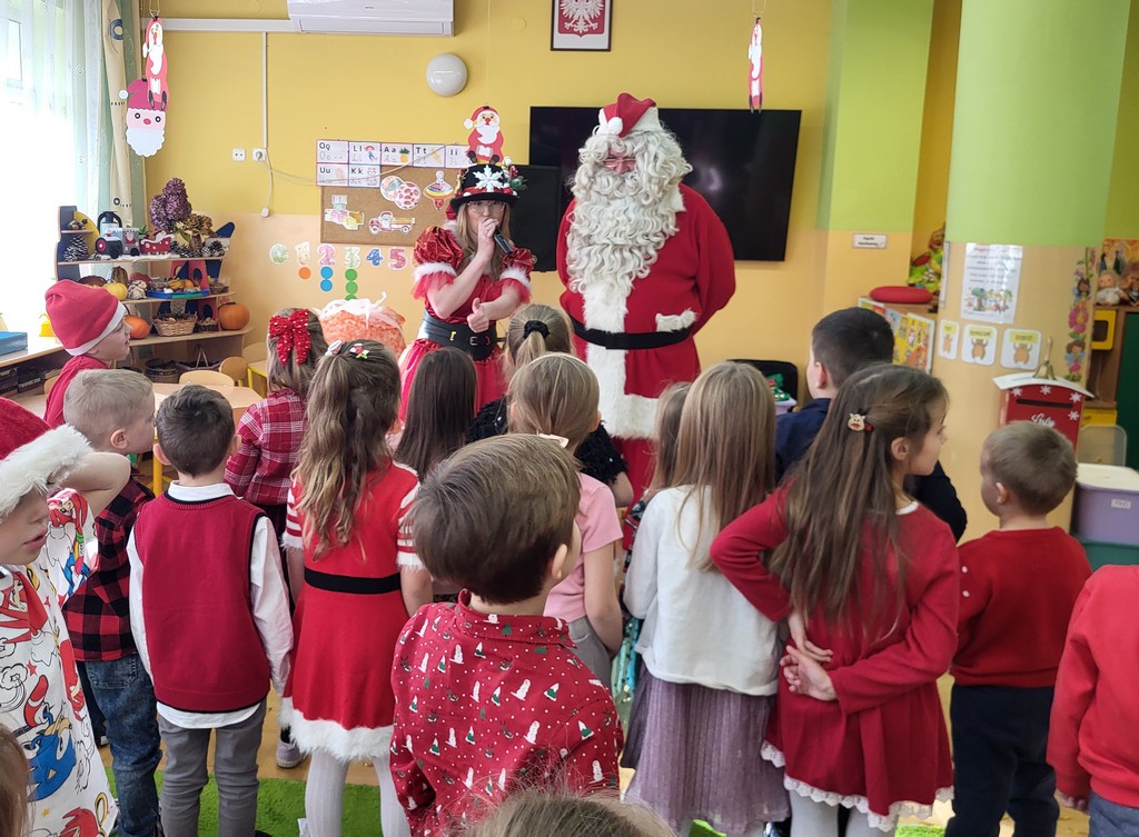 W poniedziałek, 1 grudnia, nasze przedszkole odwiedził wyjątkowy gość – Święty Mikołaj! Zanim pojawił się w salach, dzieci uczestniczyły w radosnej zabawie tanecznej prowadzonej przez panią Elf. Przedszkolaki tańczyły i bawiły się przy rytmach świątecznych utworów. Nie zabrakło zabaw z wykorzystaniem świątecznych rekwizytów: cukierków–grzechotek oraz małych tamburynków, które dodawały energii całej zabawie. Była też bitwa na śnieżki ze „śniegu” zrobionego z pianki poliuretanowej. Gdy do drzwi zapukał Mikołaj, na twarzach dzieci natychmiast zagościł zachwyt. Wspólnie z Mikołajem zatańczyliśmy przygotowany dla niego taniec. Każde dziecko otrzymało od niego piękny prezent, a na pamiątkę tego wyjątkowego spotkania zrobiło sobie z Mikołajem pamiątkowe zdjęcie. To był dzień pełen ciepła, uśmiechu i świątecznej atmosfery, który na długo pozostanie w pamięci naszych przedszkolaków.