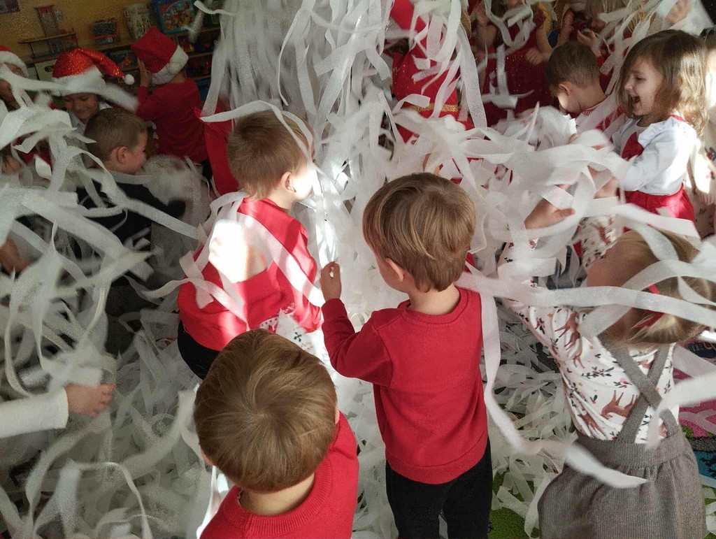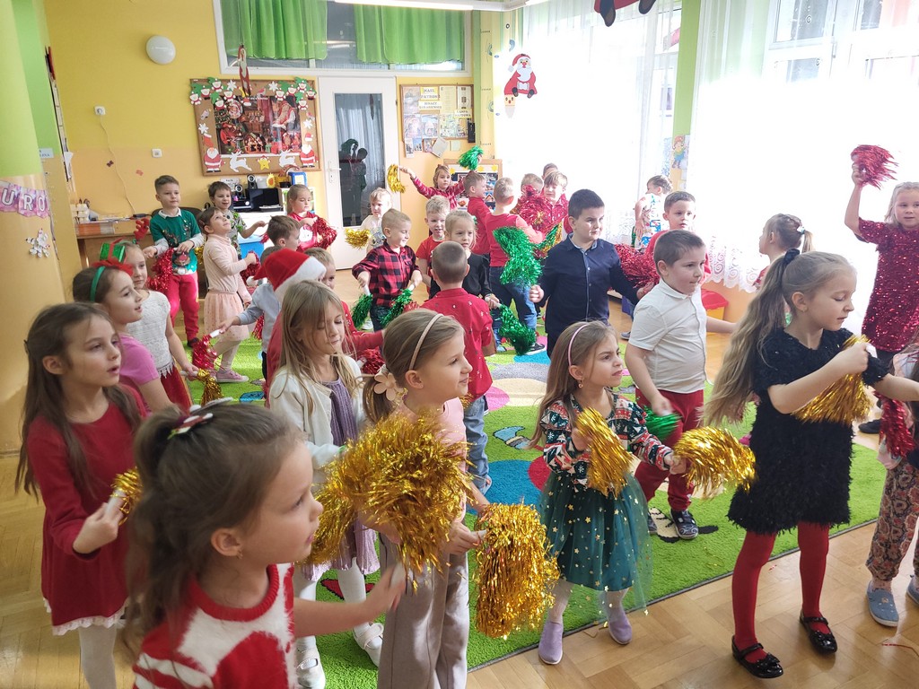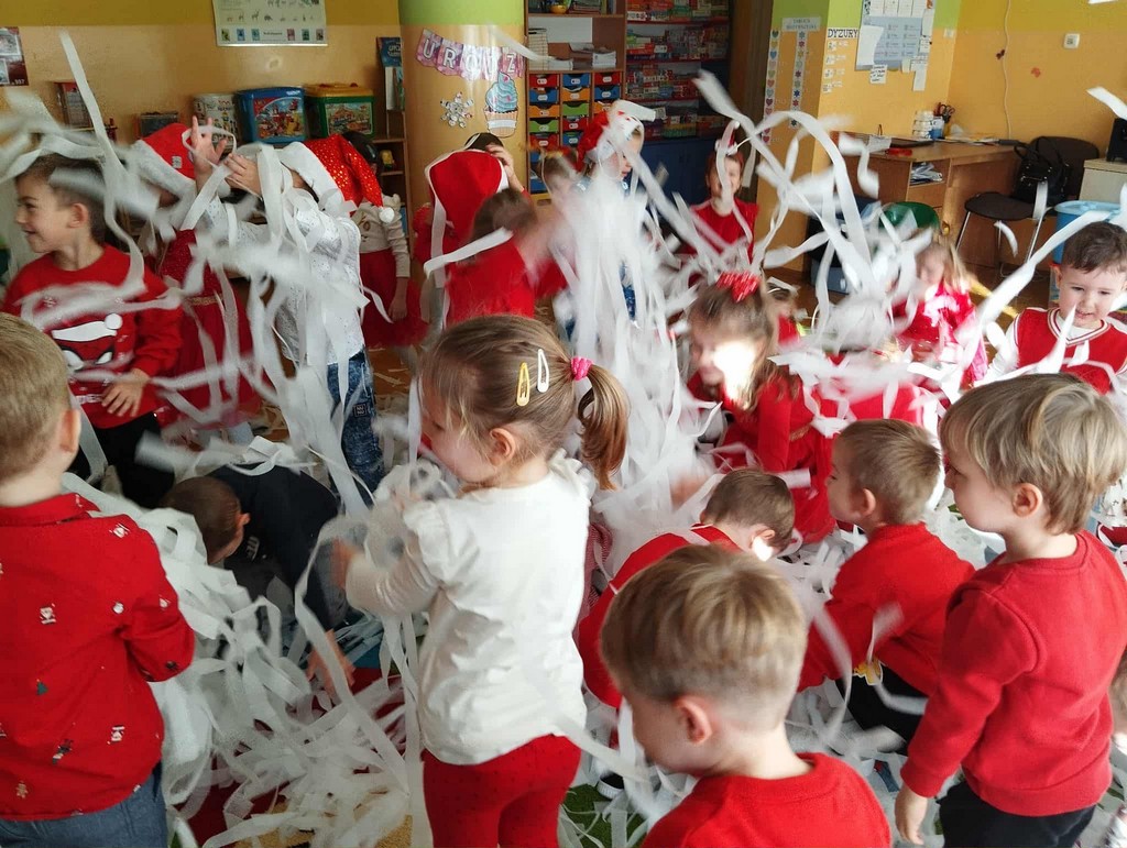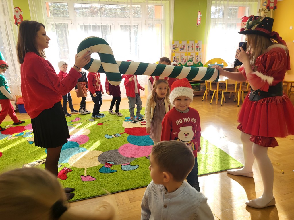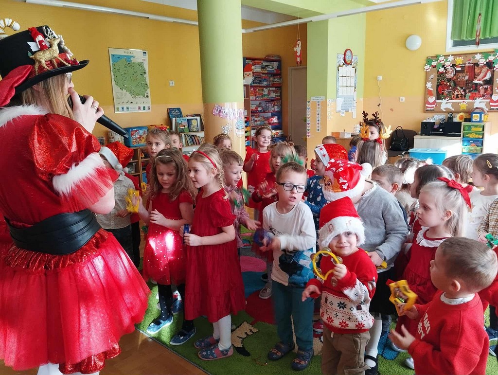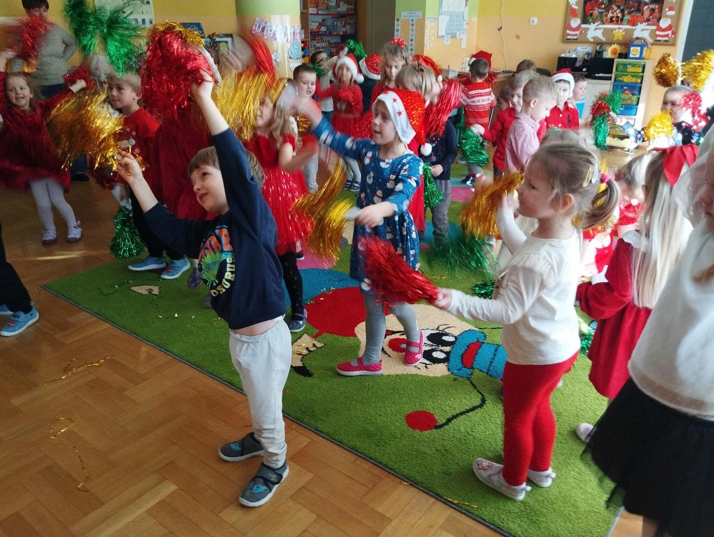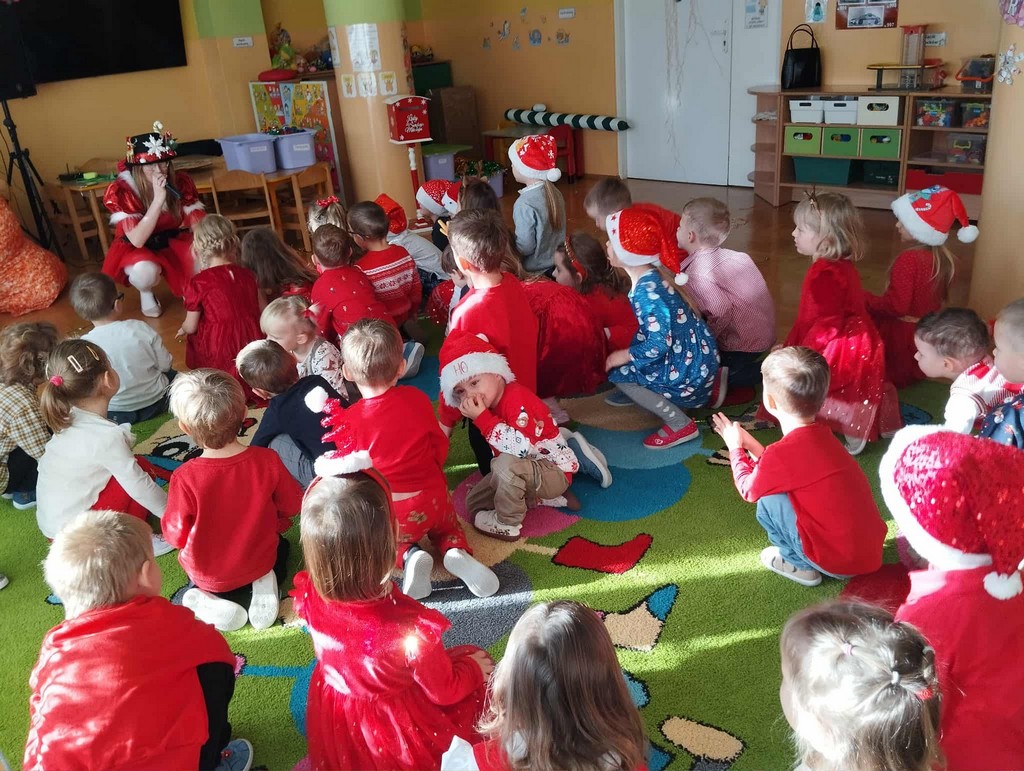 W poniedziałek, 1 grudnia, nasze przedszkole odwiedził wyjątkowy gość – Święty Mikołaj! Zanim pojawił się w salach, dzieci uczestniczyły w radosnej zabawie tanecznej prowadzonej przez panią Elf. Przedszkolaki tańczyły i bawiły się przy rytmach świątecznych utworów. Nie zabrakło zabaw z wykorzystaniem świątecznych rekwizytów: cukierków–grzechotek oraz małych tamburynków, które dodawały energii całej zabawie. Była też bitwa na śnieżki ze „śniegu” zrobionego z pianki poliuretanowej. Gdy do drzwi zapukał Mikołaj, na twarzach dzieci natychmiast zagościł zachwyt. Wspólnie z Mikołajem zatańczyliśmy przygotowany dla niego taniec. Każde dziecko otrzymało od niego piękny prezent, a na pamiątkę tego wyjątkowego spotkania zrobiło sobie z Mikołajem pamiątkowe zdjęcie. To był dzień pełen ciepła, uśmiechu i świątecznej atmosfery, który na długo pozostanie w pamięci naszych przedszkolaków.
