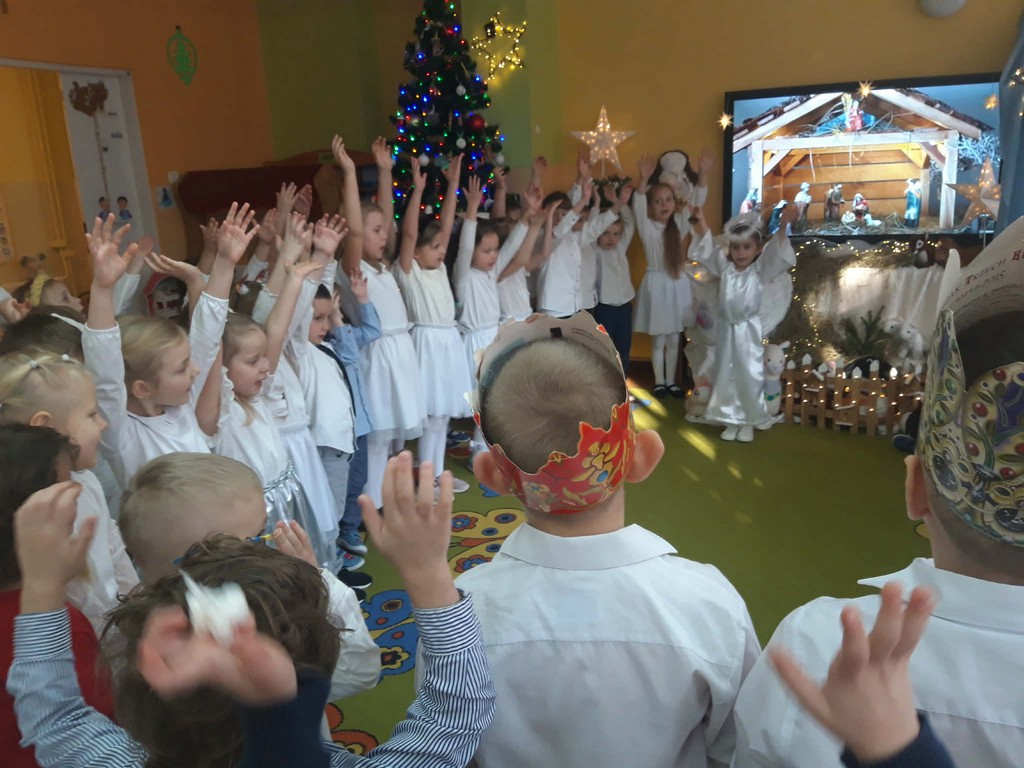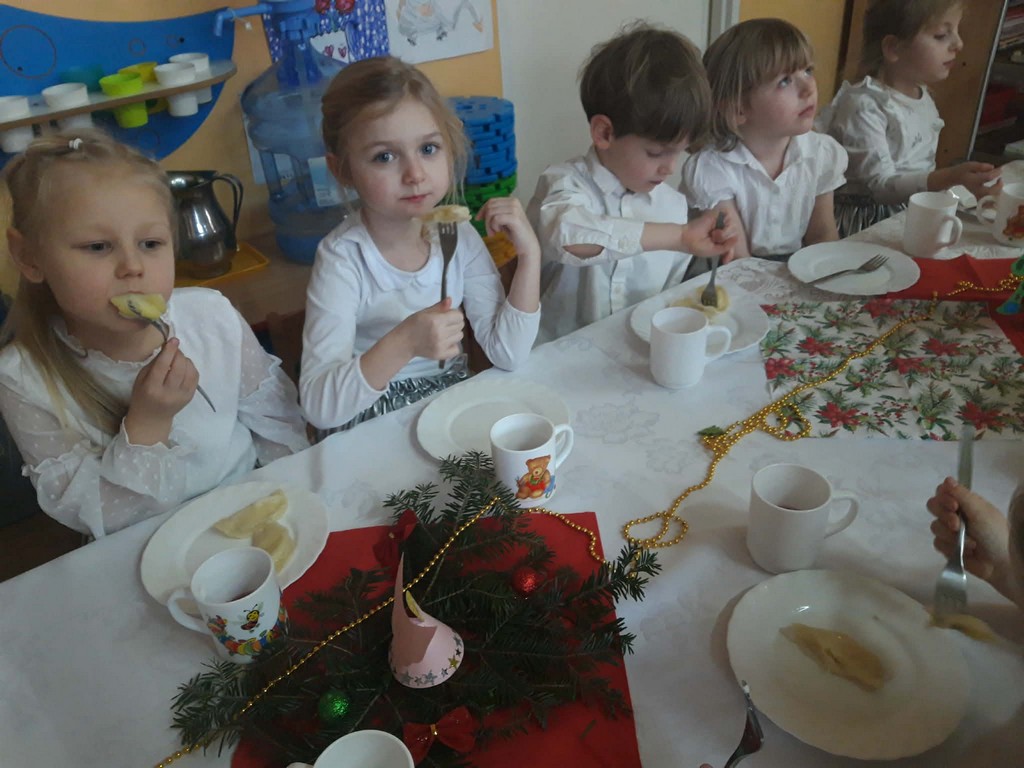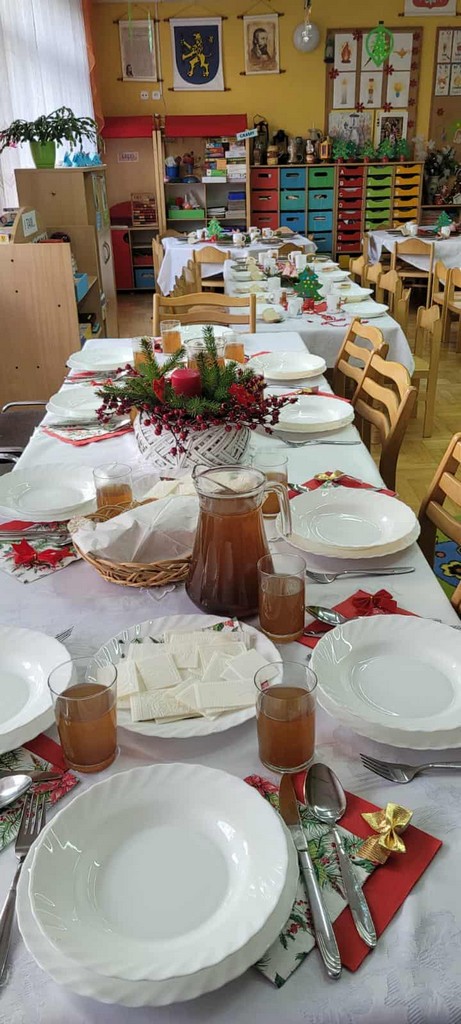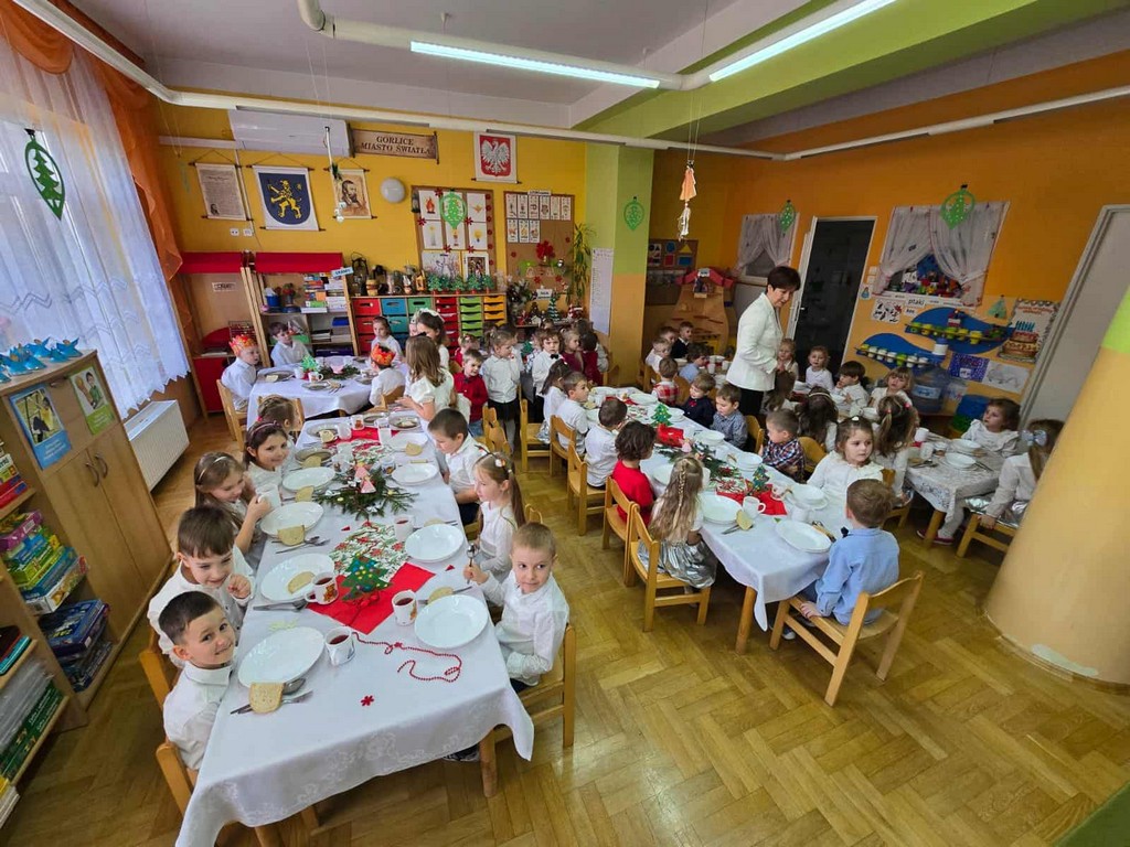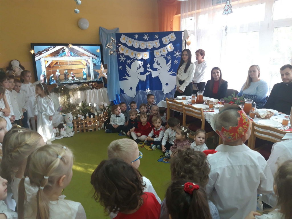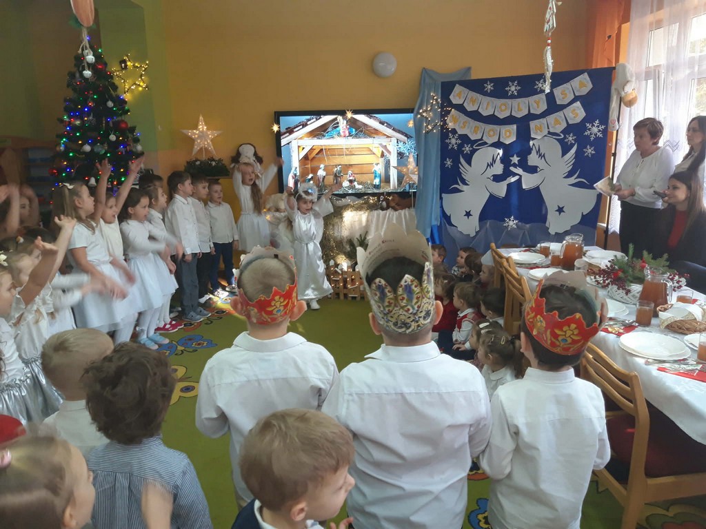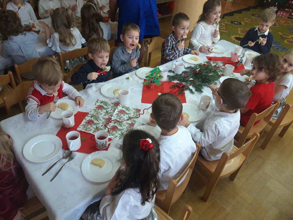 Od samego rana w całym przedszkolu unosił się zapach świątecznych potraw oraz aromat choinek, a odświętnie ubrane dzieci z niecierpliwością oczekiwały rozpoczęcia uroczystości. Przedszkolaki przygotowały i zaprezentowały okolicznościowy montaż słowno – muzyczny, który wszystkich zachwycił. Po części artystycznej nastąpił moment dzielenia się opłatkiem i wzajemnych życzeń. Następnie wraz z zaproszonymi gośćmi; Panem Dyrektorem, Radą Rodziców oraz personelem przedszkola usiedliśmy do wigilijnego obiadu. Atmosfera miłości i spokoju wprowadziła wszystkich