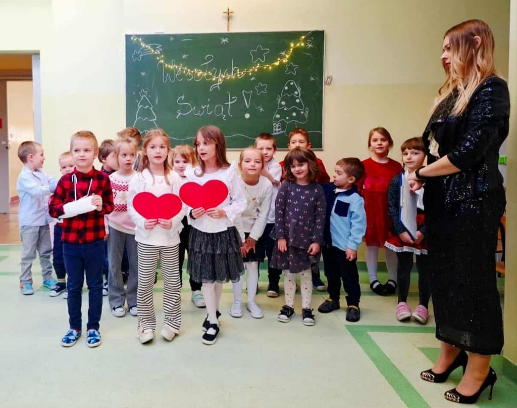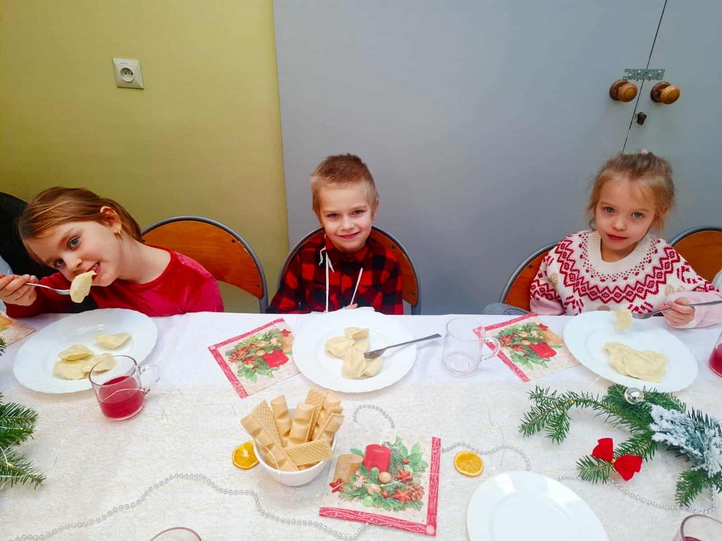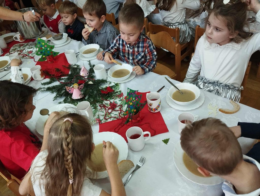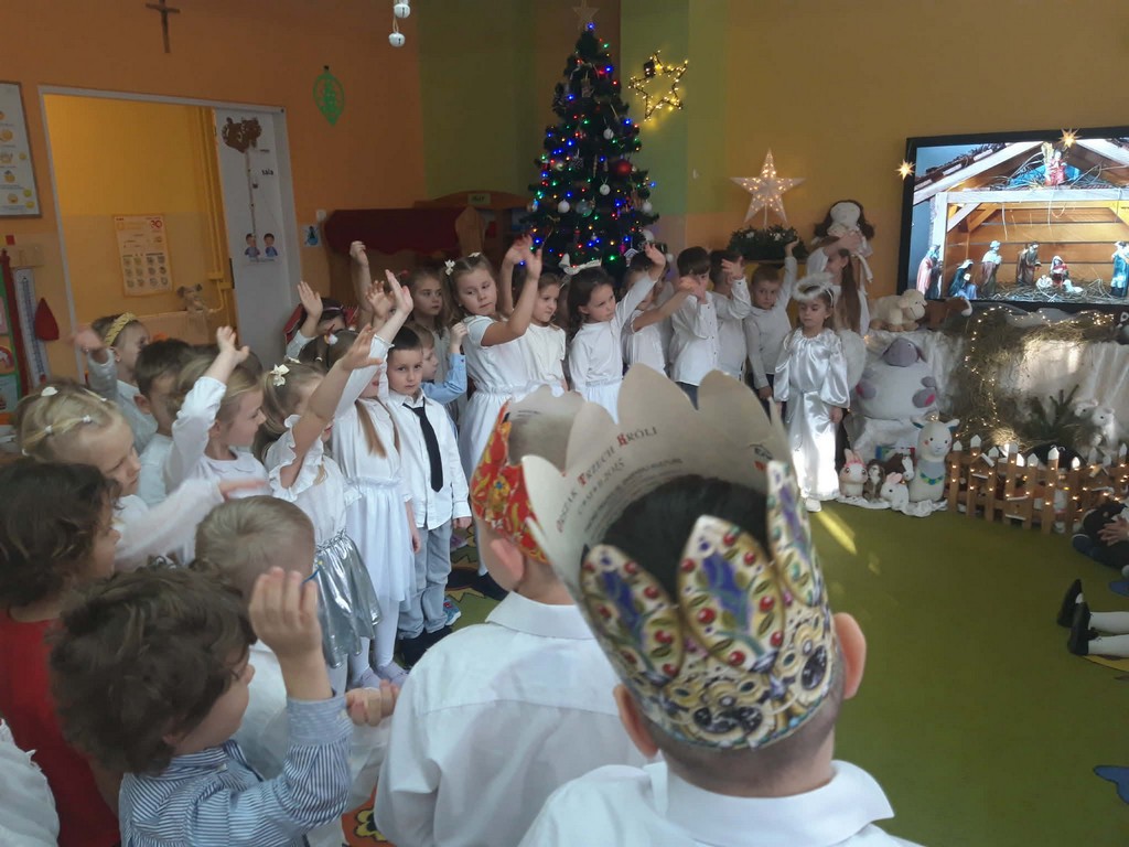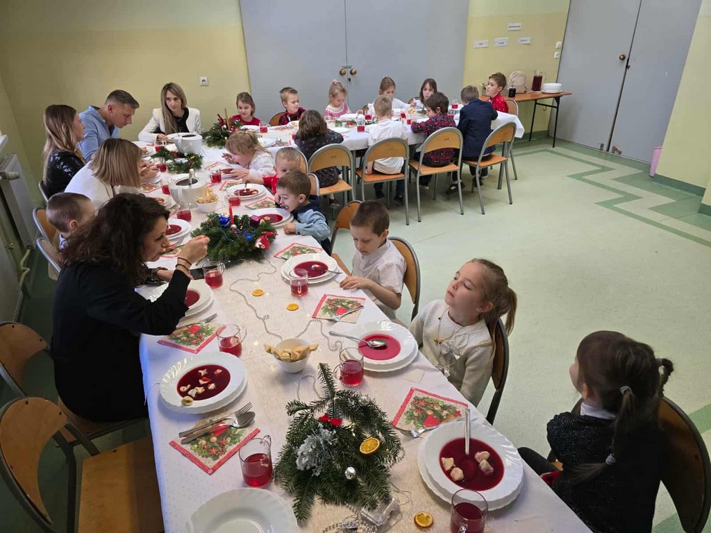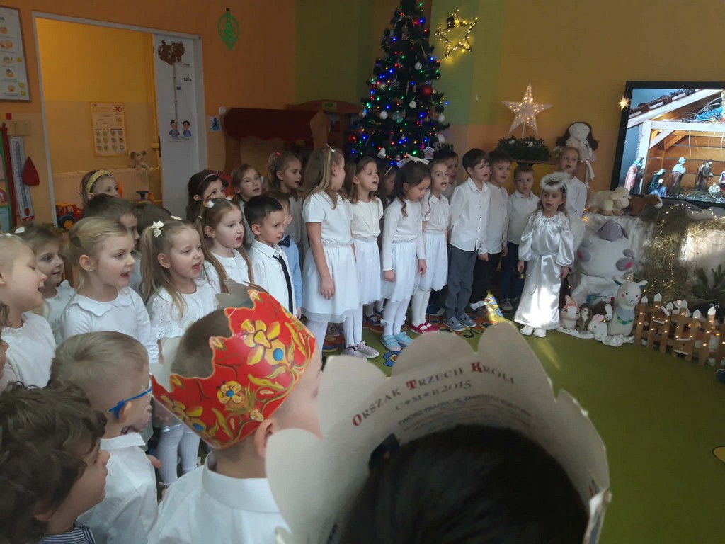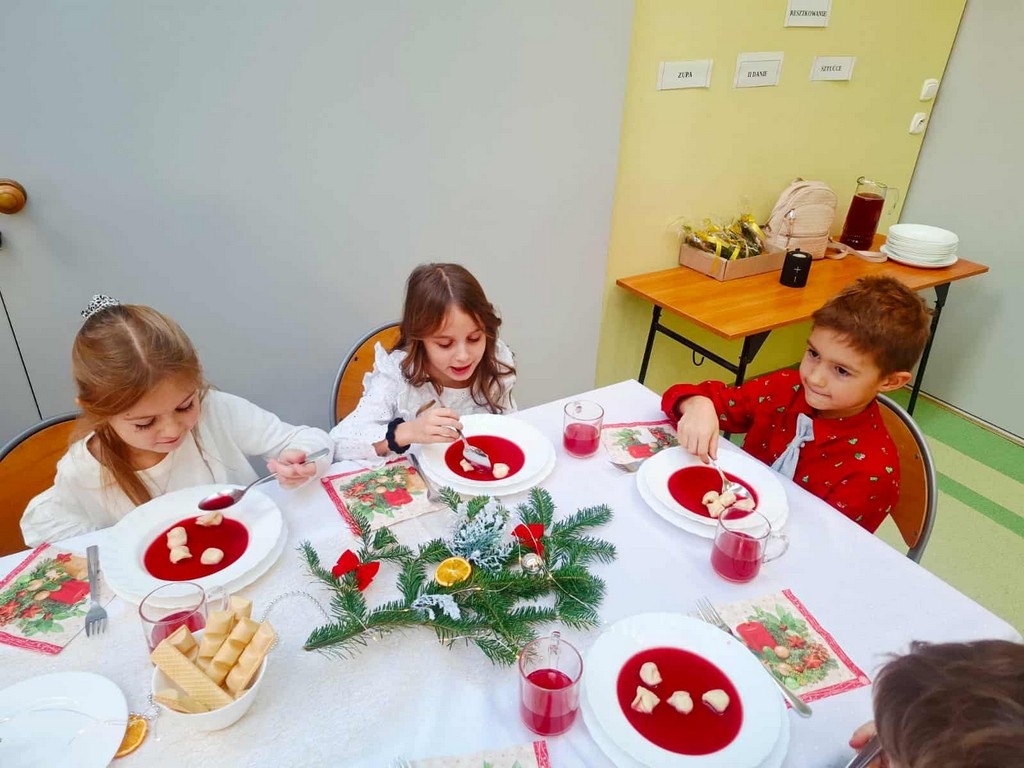 Od samego rana w całym przedszkolu unosił się zapach świątecznych potraw oraz aromat choinek, a odświętnie ubrane dzieci z niecierpliwością oczekiwały rozpoczęcia uroczystości. Przedszkolaki przygotowały i zaprezentowały okolicznościowy montaż słowno – muzyczny, który wszystkich zachwycił. Po części artystycznej nastąpił moment dzielenia się opłatkiem i wzajemnych życzeń. Następnie wraz z zaproszonymi gośćmi; Panem Dyrektorem, Radą Rodziców oraz personelem przedszkola usiedliśmy do wigilijnego obiadu. Atmosfera miłości i spokoju wprowadziła wszystkich